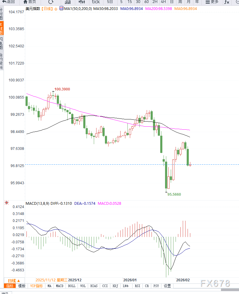 市场接下来将重点关注延迟公布的1月就业报告以及即将发布的CPI数据。这些数据将成为判断美国经济是否持续降温、以及美联储降息节奏的重要依据,并可能决定美元指数短期方向。从技术结构来看,美元指数整体仍处于弱势整理区间。价格持续运行在关键中期均线下方,反映出趋势性动能尚未恢复。短周期反弹多次受限,显示上方抛压依然存在。